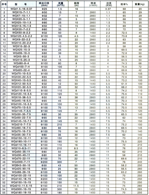 WQ型系列無堵塞潛水泵是根據(jù)九五年國家專利技術(shù)生產(chǎn)的新型離心泵。該泵在設(shè)計(jì)上綜合地吸收了瑞典科學(xué)的葉輪水力設(shè)計(jì)和西德合理的整體結(jié)構(gòu)、快速的安裝技術(shù),以及日本完整的保護(hù)裝置和先進(jìn)的機(jī)械密封,效率高,能耗少、運(yùn)行可靠。泵的性能、結(jié)構(gòu)、安裝尺寸和技術(shù)要求均符合中華人民共和國城鄉(xiāng)建設(shè)行業(yè)標(biāo)準(zhǔn),因此在國內(nèi)排水排污行業(yè)得到了廣泛的應(yīng)用。